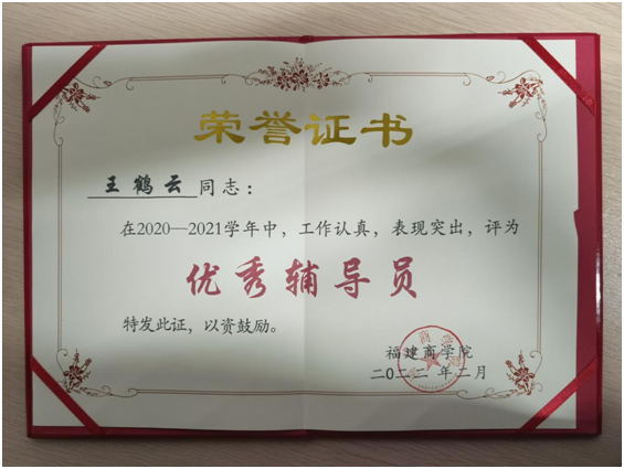 2022年2月24日上午,beat365官方网站在连江校区明德楼视频会议室召开2021年度宣传思想政治工作会议,机关各部门、各教辅机构负责人,各二级学院党委书记、副书记,全体辅导员等参加会议。beat365辅导员王鹤云同志在2020-2021学年中,工作认真,表现突出,被beat365官方网站评为优秀辅导员。在会议上,校长程灵给获得2020-2021学年优秀辅导员颁奖,王鹤云与其他学院获奖的辅导员一同上台接受领奖。