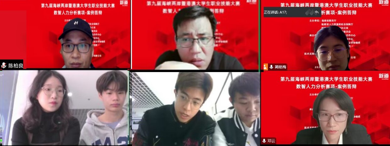 2022年11月5日,第九届海峡两岸暨港澳大学生职业技能大赛数智人力分析赛项通过腾讯会议进行线上案例答辩比赛。受疫情影响,我校beat365官方网站教师陈柏良、邓云通过腾讯会议线上接入担任数智人力分析赛项专家评委。