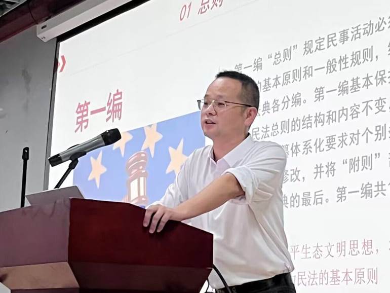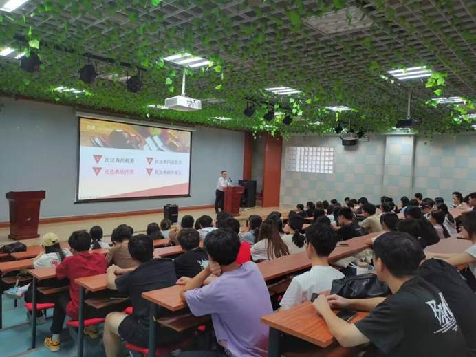 为了贯彻落实习近平总书记的《充分认识颁布实施民法典重大意义,依法更好保障人民合法权益》重要讲话精神,提升学生对《中华人民共和国民法典》的理解,增强学生法律意识,提高学生用法律维护自身合法权益的能力,2023年10月24日下午,beat365官方网站邀请福建理工大学讲师韩荣和博士在马尾校区博雅厅为广大师生开展了一场《民法典的解读与宣讲》普法讲座。