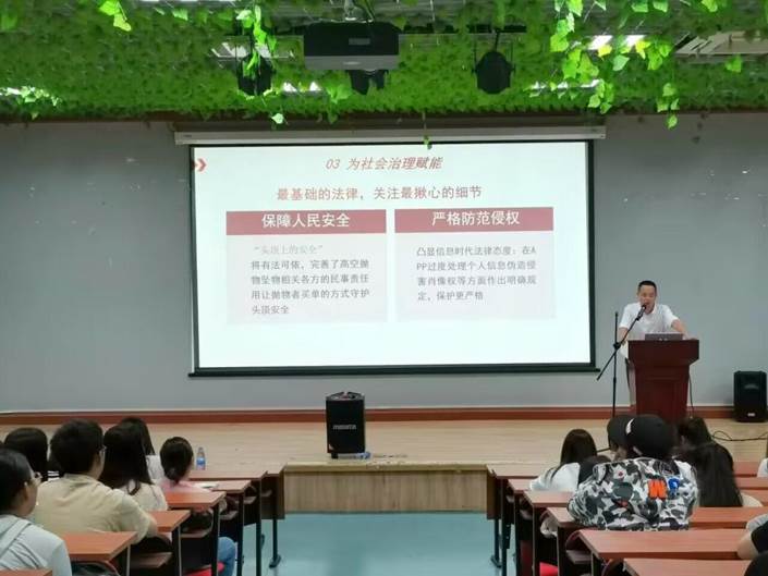 韩荣和博士常年从事民商事、社会法的教学、研究与司法实践。讲座中,韩老师结合自身工作经历和司法实践,围绕民法典的内容、作用及颁布意义等,对民法典中的物权、人权、婚姻家庭、继承权、侵权等各方面进行深入解读,并列举了贴近学生日常生活的有关案例进行分析,将枯燥的法律条文化为通俗易懂的语言,加深了学生对民法典具体内容的认知。