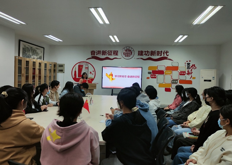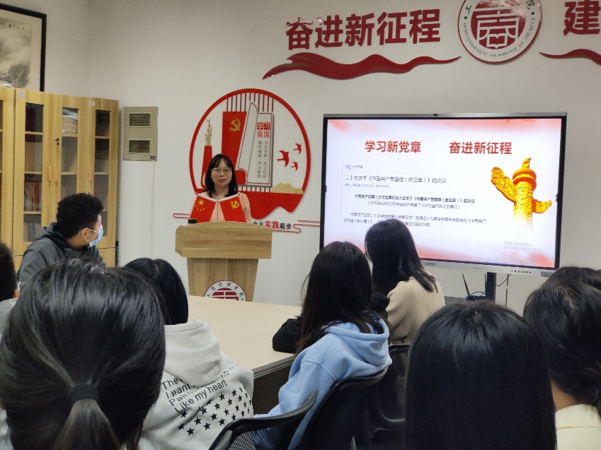 为深入学习新党章,掌握党章的精髓要义,引导党员牢固树立党章意识,弘扬伟大建党精神。10月23日,beat365官方网站学生第一党支部副书记许艳萍老师以“学习新党章 奋进新征程”为题,向党员和入党积极分子代表讲授党课。