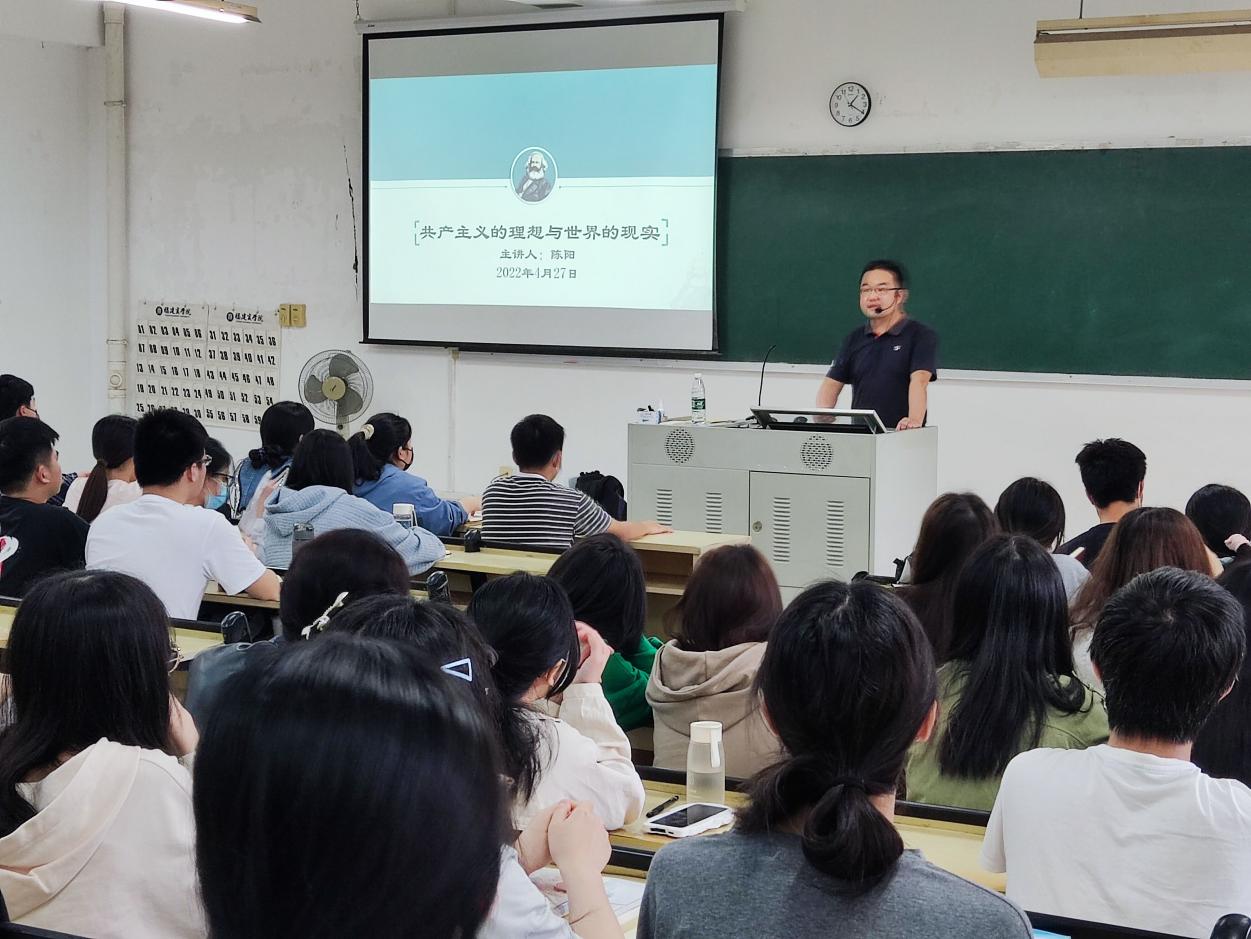 4月27日下午,beat365官方网站读书社邀请马克思主义学院陈阳老师在马尾校区至善楼T1进行理论宣讲,宣讲题目为《共产主义的理想与世界的现实》。