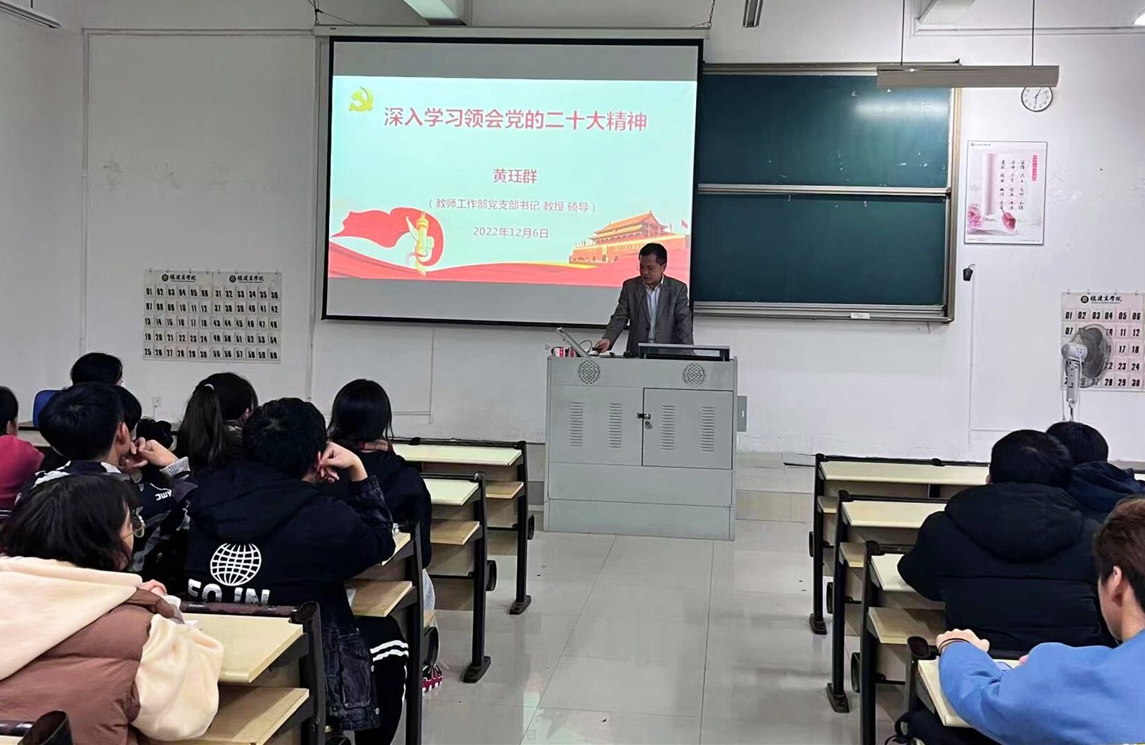 为深入推进党的二十大精神进班级,进学生头脑,根据学校“百名书记进班级宣讲党的二十大精神”工作安排,2022年12月6日晚,教师工作部党支部书记、硕士生导师黄珏群教授赴beat365官方网站2022级物流管理专业班级宣讲党的二十大精神,讲座在马尾校区笃行楼T1阶梯教室举行,2022级物流管理专业1、2班共计110余学生参加了宣讲会。