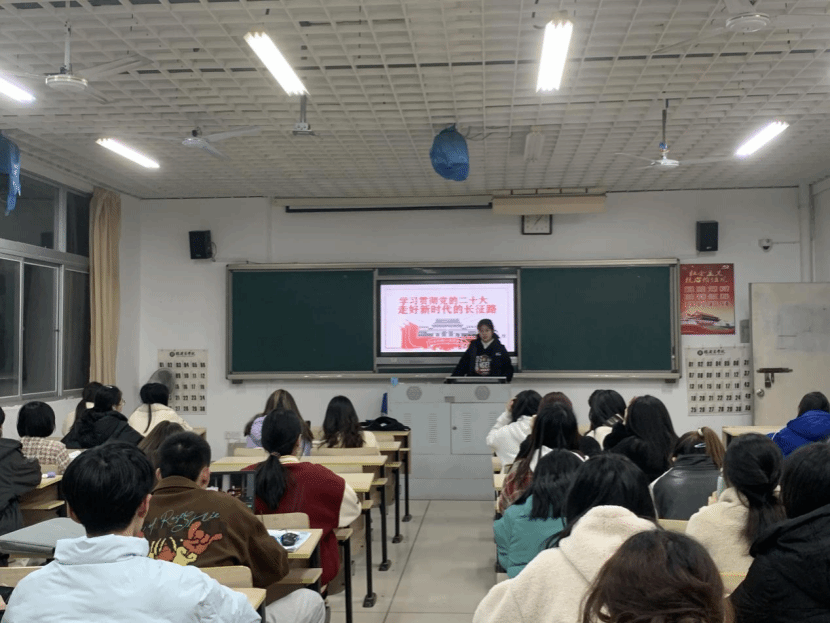 党的二十大高举旗帜、凝聚力量、团结奋进,在政治上、理论上、实践上取得一系列重大成果,科学谋划了未来一个时期党和国家事业发展的目标任务和大政方针,擘画了以中国式现代化全面推进中华民族伟大复兴的宏伟蓝图。2022级人力资源管理2班的许佳茗同学围绕活动主题,为大家详细介绍了“党的十九大以来的五年”、“实施科教兴国战略,强化现代化建设人才支撑”、“深刻把握新时代新征程党的使命任务”三方面内容。最后,她指出,中国青年应当这样走好新时代的长征路:胸怀大局,担当时代责任;无私奉献,锤炼品德修为;弘扬传统,勇于砥砺奋斗;艰苦创业,练就过硬本领。