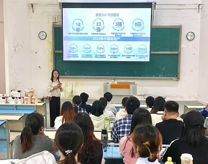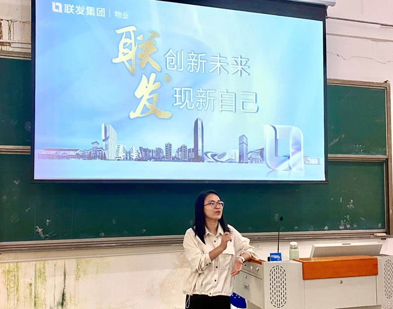 宣讲会由联发物业招聘负责人及企业代表肖文娜担任主讲。她围绕企业发展历程、业务布局与企业文化等方面,系统介绍了联发物业作为全国性服务企业的综合实力与未来愿景。随后,她针对本次校招重点推出“社区管家岗”“工程技术岗”及“商写服务岗”等岗位,详细说明了岗位职责、培养路径及网申流程,帮助同学们明晰职业发展方向。