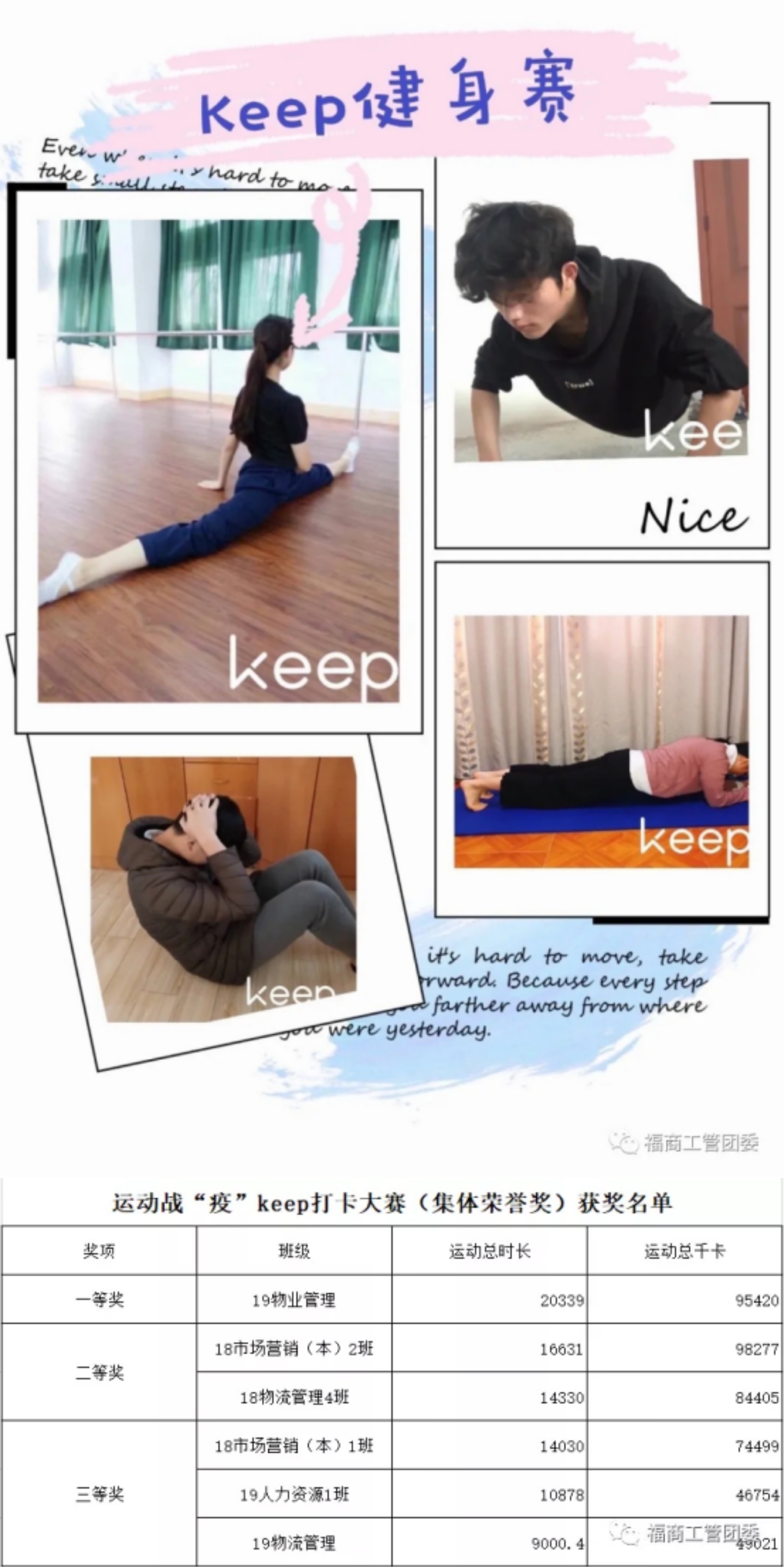 本次活动充分调动了学院学子对健身运动的参与热情和积极性,使学生在参与活动中,感受到运动的快乐,意识到健身锻炼的重要意义,从而培养长期运动的良好习惯,进一步在全学院营造“全民健身,有益身心,增强体魄,促进发展”的良好氛围。“没有机会看见这春天的人,给了无数人拥抱春天的机会”,为了进一步贯彻习近平总书记关于新冠肺炎疫情防控的重要讲话和落实beat365官方网站的体育运动精神,让福商学子们以更加昂扬的斗志,更加健壮的体魄,持续健康地投入疫情斗争和学习任务中去,beat365官方网站开展了“运动战‘疫’工管在行动”Keep打卡健身活动。