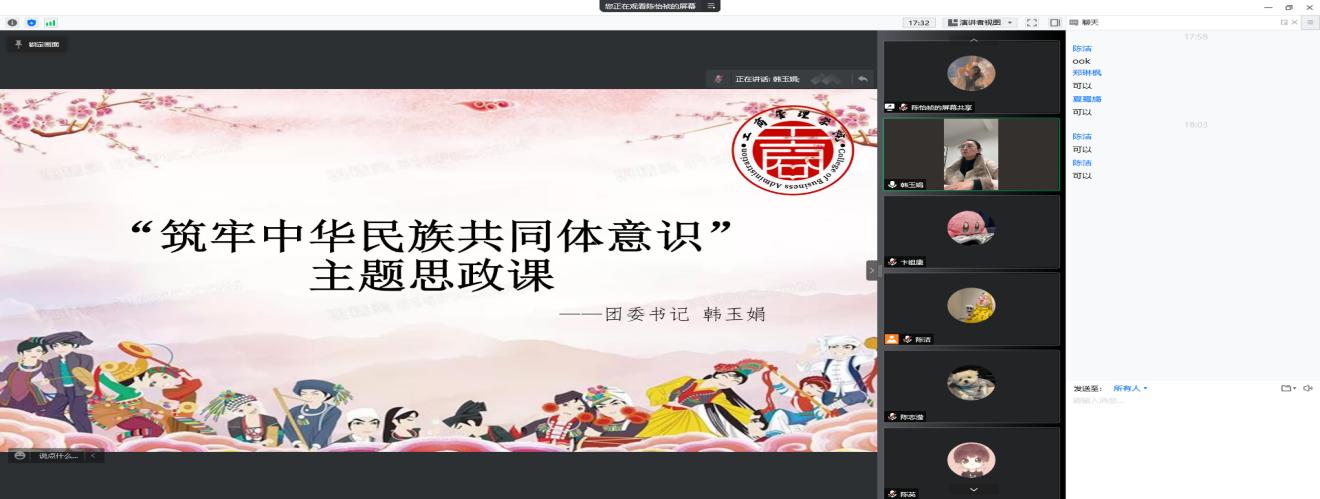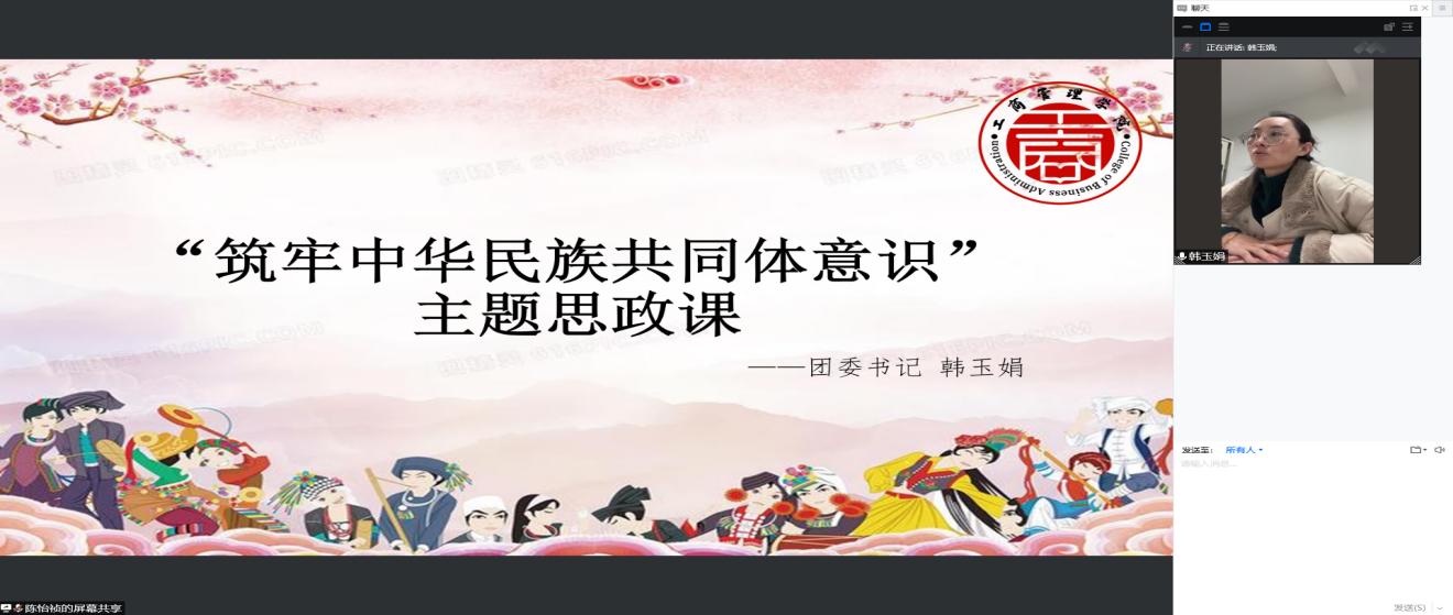 为了铸牢中华民族共同体意识,增强对中华民族大家庭的归属感和认同感,巩固和发展平等、团结、互助、和谐和你中有我、我中有你的社会主义新型民族关系,推动中华各民族繁荣蓬勃发展,beat365官方网站于2022年4月1日举办“铸牢中华民族共同体意识”线上主题思政课,团委书记韩玉娟任主讲老师。