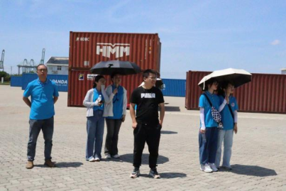 在铁路物流园大门口,詹经理向实践队员们介绍了江阴铁路物流园区建设与运营基本情况。据介绍,铁路物流园约2200亩,具备海铁联运、公铁联运、商品汽车、集装箱、大型仓储配送等功能。今年一季度,海铁联运到发箱量累计完成1.18万标箱,比增92.24%。